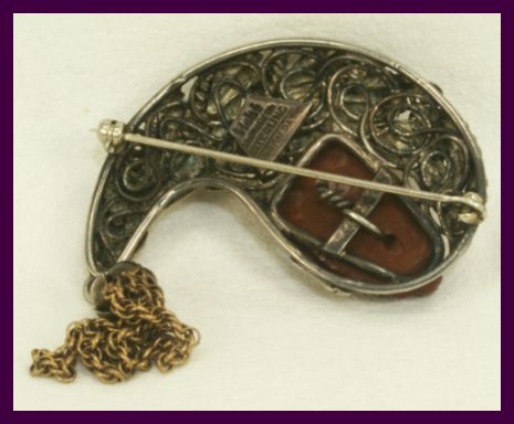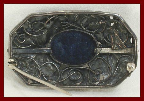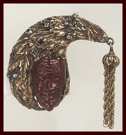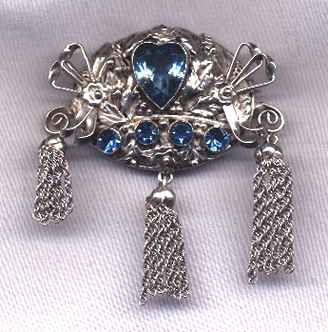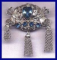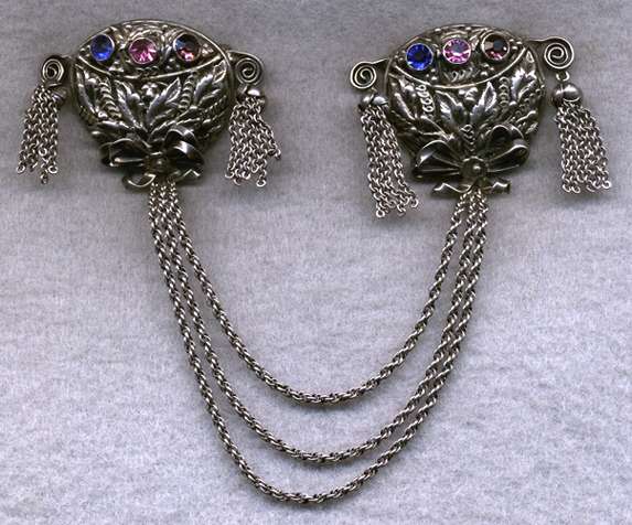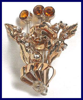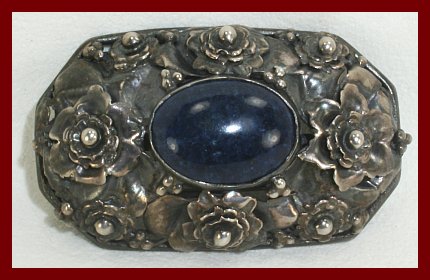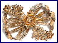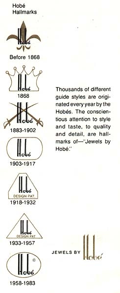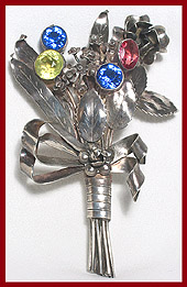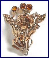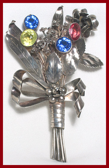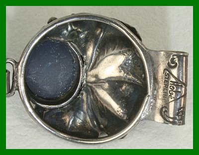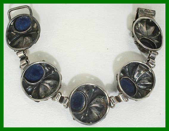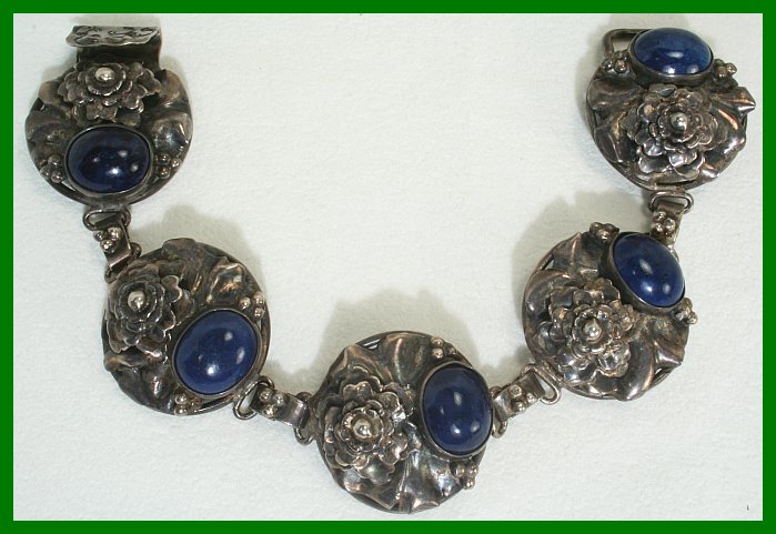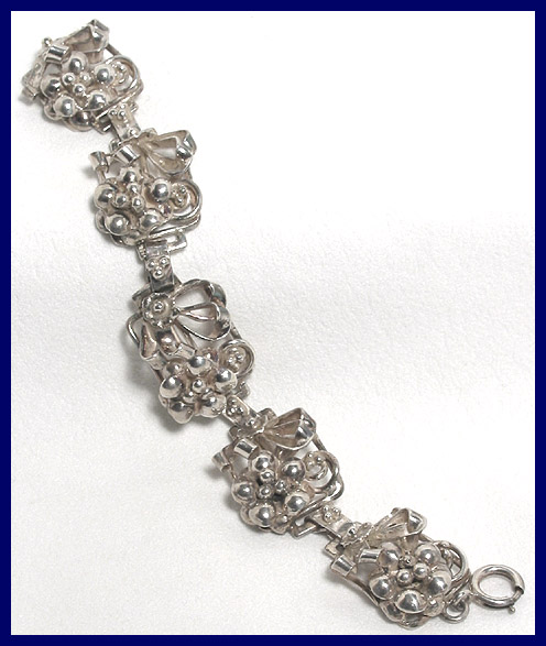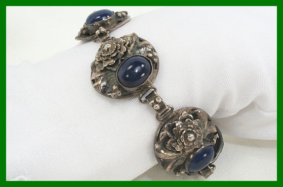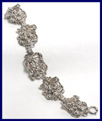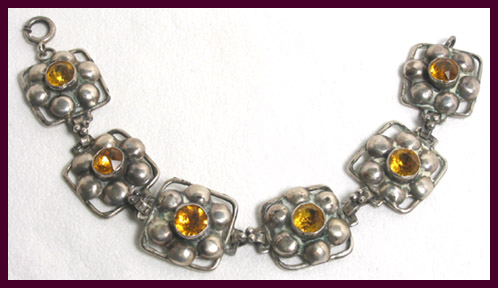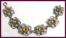 Lovely Citrine colored bezel set rhinestones in this classy classic. Marked Hobe' Sterling in an applied geometric shape. Measures 6-1/2". Very Good Condition #2564, $195.00 |