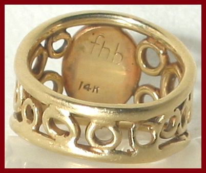 wrapped wire. After a successful store on Fifth Avenue, New York, Frank Rebajes decided to live in Spain, seeking a simpler life. He discovered a small beach town, Torremolinos in San Miguel, where he set up shop and was quickly discovered by the Jet Set. The works he produced in Spain were one-of-a-kind. Marked Original, Hand Wrought, Rebajes, Design. Stone measures a large 1-1/8" x 5/8", Size 8-1/2. Excellent Condition. #2847, $295.00 For an intimate story of Frank Rebajes life, written by, Patricia Riveron Lee, Artist and daughter of Enrique Riveron, Artist and close family friend of Frank Rebajes, see Modern Silver Magazine, Uncle Frank. "Uncle Frank," the story of Frank Rebajes ![]() |