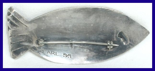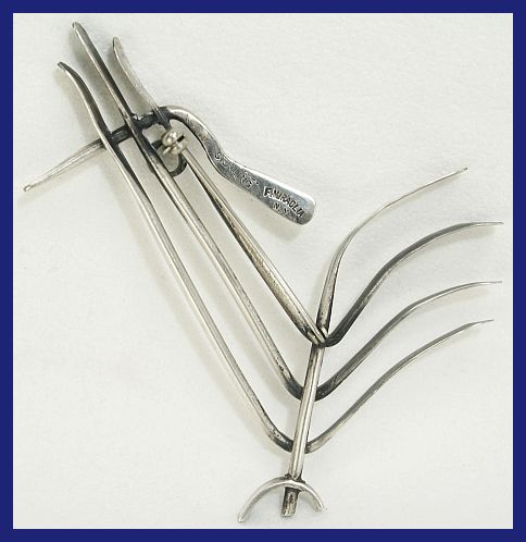 handmade. The artist is featured in the book, MODERNIST JEWELRY 1930-1960, The Wearable Art Movement, by Marbeth Schon, and in the 2008 Fort Wayne, Indiana exhibit titled American Modernist Jewelry, 1940-1970, and is included in the companion book/catalogue Form and Function American Modernist Jewelry 1940-1970, by Marbeth Schon. Marked Sterling Rebajes on an applied oval on the back. Measures 3-1/2" Excellent Conditions #3029, $350.00 For an intimate story of Frank Rebajes life, written by, Patricia Riveron Lee, Artist and daughter of Enrique Riveron, Artist and close family friend of Frank Rebajes, see Modern Silver Magazine, Uncle Frank. "Uncle Frank," the story of Frank Rebajes ![]() |