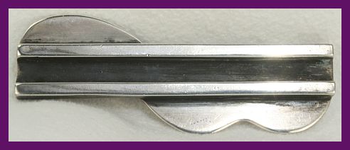 VINTAGE STERLING SILVER BROOCH, A Large Geometric form accented with a diagonal counter-shape; nice weight, thickness. A reknowned Polish artist, he has 3 shops in Warsaw. See Marbeth Schon's Modern Silver Magazine for an Interview with Marcin Zaremski, by Ron and Barbara Marshall. http://www.modernsilver.com/marcinzaremski.htm Marked M. Zaremski MJZ 'Eye' mark, 925,. Measures a substantial 3-7/8" x 3/4". Excellent Condition. #2795, $250.00 ![]() |