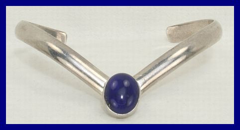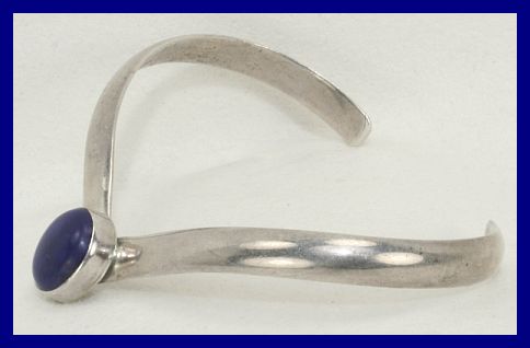 Lapis stone in a bezel setting. Little is known of the history of Felice, but is believed to have worked in New York City in the 1950s. Another example of Felice's work can be seen at the San Francisco exhibition: A Day at The Grand Opening of Macchiarini Creative Design and Metalworks Gallery Marked Felice Sterling Handmade Measures, Center Motif 1-3/4" x 1-1/8"; fits 6-1/2" closed to 7-1/2" open. Very Good Condition. #3058, $395.00 ![]() ![]() bracelet open![]() |