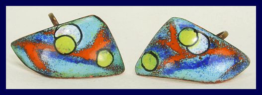 colors; Mauve, Translucent Green, and Gold . Doris Hall and her Husband, Kubinysi, worked together as well as individually, producing work from the late 1930s to early 1970s. Kubinysi's primary function in the works were laying the groundwork for Hall's enamel paintings. They worked in both small scale as well as large scale projects in decorative art and jewelry. They received many prestigious awards, exhibited extensively, and were represented in galleries, and museums. Halls work was in recent exhibitions, Painting with Fire, Masters of Enameling in America, 1930s-1980s, at the Long Beach Museum of Art, and American Moderist Jewelry, at Ft. Wayne Museum of Art. Examples of Hall's work are in Modern Jewelry, 1930-1960, and the compainion book to the Ft. Wayne Exhibition, Form and Function, American Moderist Jewelry 1940s-1970s, by Marbeth Schon, and the companion book the Painting with fire, Masters of Enameling, 1930s - 1980s, of the same name, by Bernard N. Jazzar and Harold B. Nelson. Signed Doris Hall on the back. Measures 3" x 1/2" deep Very Good Condition. #3074, $175.00 ![]() For reviews of these exhibitions, go to: Painting with Fire http://www.modernsilver.com/june07/paintingwithfire.htm American Modernist Jewelry http://www.modernsilver.com/Americanmodernistjewelry.htm |